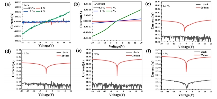 圖1. 在(a)黑暗和(b)254納米光照下,不同溶液中Si-Ga原子比例的樣品顯示出線性I-V特性。α-Ga2O3紫外探測器在黑暗和254納米光照下的I-V特性:(c) 0.3%,(d) 1%,(e) 2%和(f) 4%硅摻雜α-Ga2O3。