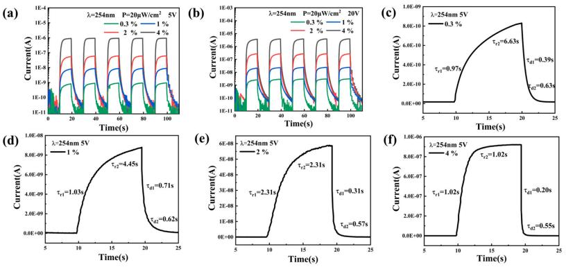 圖2. 在254納米和20微瓦/平方厘米光照射下,不同溶液中Si-Ga原子比例的α-Ga2O3:Si光電探測器在偏壓(a) 5V和(b) 20V下的光響應的時間變化特性。在5V偏壓下,254納米、20微瓦/平方厘米光照中單周期內(nèi)(c) 0.3%,(d) 1%,(e) 2%和(f) 4%的瞬態(tài)響應的放大。