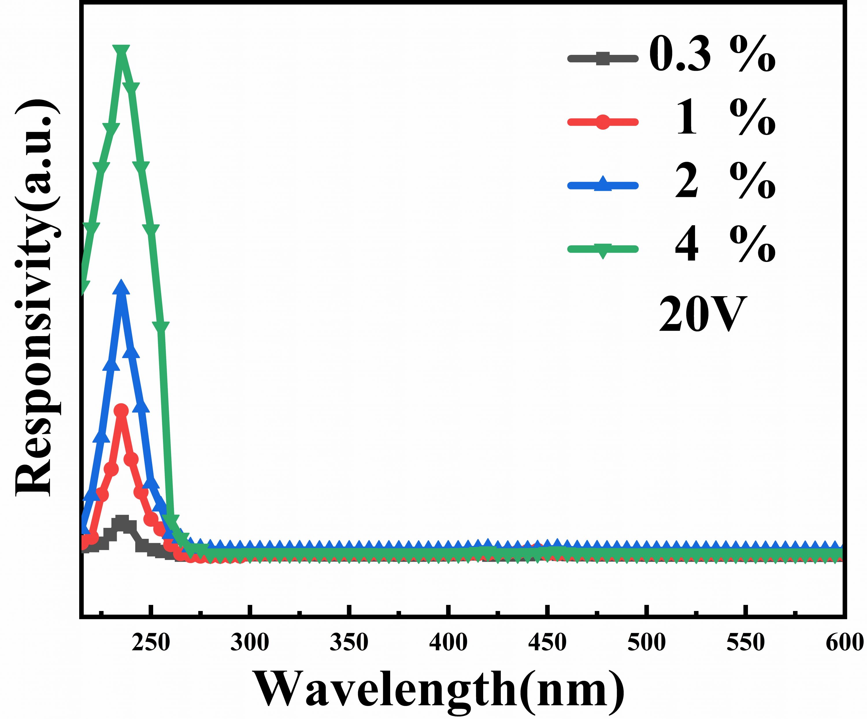 圖4. α-Ga2O3光電探測器在不同Si/Ga原子比例下的光譜響應度。
