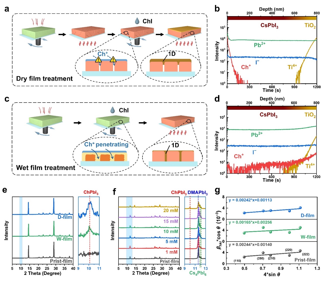碘化膽堿(ChI)處理被證明可以有效鈍化CsPbI3薄膜的表面缺陷,在退火后處理(干膜處理)過程中,ChI與CsPbI3通過離子交換反應(yīng)形成1D ChPbI3,從而構(gòu)建1D/3D異質(zhì)結(jié)構(gòu)。然而,由于Ch+的滲透性有限,Ch+很難穿透整個(gè)鈣鈦礦薄膜并在體相中形成LD鈣鈦礦。因此,傳統(tǒng)的干膜處理不足以鈍化CsPbI3薄膜中的體相缺陷。鑒于此,作者利用ChI對(duì)薄膜的中間相組成的濕膜進(jìn)行處理,使ChI能夠擴(kuò)散到薄膜深處。由于ChI沿著中間相晶體的晶界滲透濕膜,生成的1D ChPbI3傾向于覆蓋CsPbI3晶體。