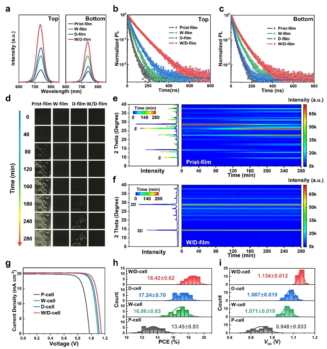 PL測(cè)試結(jié)果表明,干膜處理更有利于鈍化鈣鈦礦薄膜的表面缺陷,而濕膜處理由于ChI的高滲透性更有利于鈍化鈣鈦礦薄膜的體缺陷。為此,采用濕膜處理結(jié)合干膜處理的綜合策略來獲得W/D-film,以實(shí)現(xiàn)對(duì)CsPbI3薄膜表面和體缺陷的更有效的鈍化。另外,濕膜處理過程中Ch+滲透到整個(gè)鈣鈦礦薄膜中并得到穩(wěn)定的ChPbI3,抑制體相中δ相的形成,提高了鈣鈦礦相的穩(wěn)定性?;诰C合策略下組裝的C-PSC獲得了18.42%的冠軍效率。