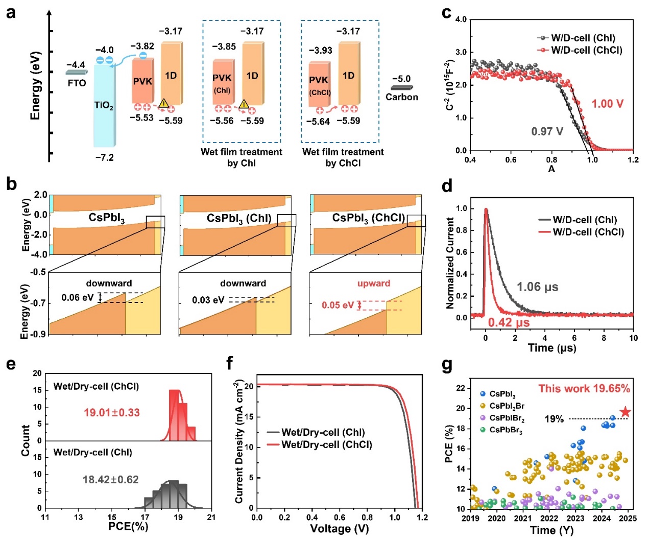 進(jìn)一步的,作者發(fā)現(xiàn),在濕膜處理過程中用ChCl代替ChI,能夠?qū)⑩}鈦礦/碳界面從向下變?yōu)橄蛏系哪軒澢?,?yōu)化了能級(jí)結(jié)構(gòu),消除了空穴提取勢(shì)壘,提高了載流子提取效率。*終獲得的CsPbI3 C-PSC的效率達(dá)到 19.65%,創(chuàng)下了無機(jī) C-PSC 的新紀(jì)錄。