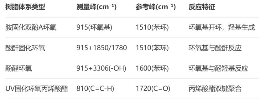 對(duì)于不同類型的環(huán)氧樹脂體系,特征峰有如下: