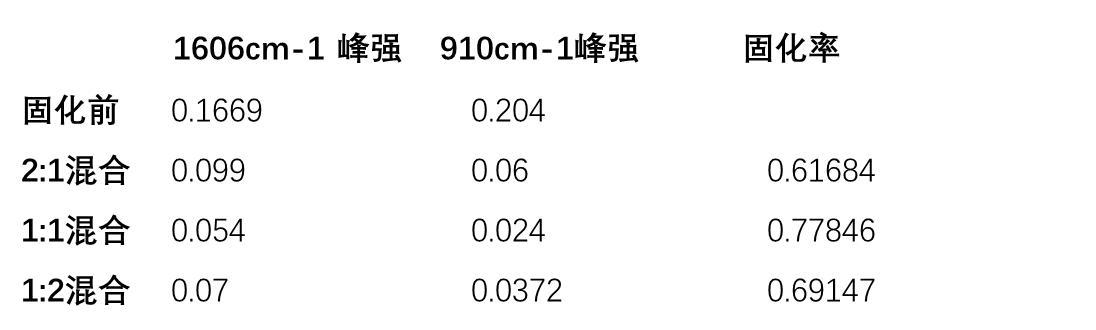 圖4和表2是雙酚A環(huán)氧樹脂固化率測(cè)試的結(jié)果。實(shí)驗(yàn)中將雙酚A環(huán)氧樹脂膠和固化劑以不同的混合比例進(jìn)行混合并室溫固化4小時(shí)再測(cè)定紅外光譜。從圖4看到,固化前后主要特征峰保持不變,室溫固化后,由于環(huán)氧鍵開環(huán)并形成羧酸陰離子和環(huán)氧基,氧基團(tuán)對(duì)應(yīng)的紅外吸收峰位處910cm-1變?nèi)酰?峰位在1607cm-1的苯環(huán)的吸收峰不受影響且沒有重疊,可以作為內(nèi)標(biāo)峰[3]。計(jì)算不同混合比例下的特征峰和內(nèi)標(biāo)峰的峰強(qiáng)和固化率的計(jì)算結(jié)果列于表2。結(jié)果發(fā)現(xiàn),在混合1:1時(shí),固化率更高,*高固化率達(dá)到77.8%,這可能和材料的質(zhì)量相關(guān)。