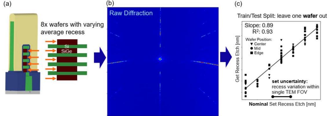 圖3、晶圓GAA 3D結(jié)構(gòu)散射測(cè)量。(a) 測(cè)量的英特爾GAA晶圓的示意圖:8個(gè)晶圓的平均凹槽蝕刻因蝕刻時(shí)間而異。(b) 從 GAA 測(cè)量的衍射圖案。 (c) 基于具有不同凹槽蝕刻時(shí)間的8個(gè)晶圓的數(shù)據(jù)驅(qū)動(dòng)推理結(jié)果。