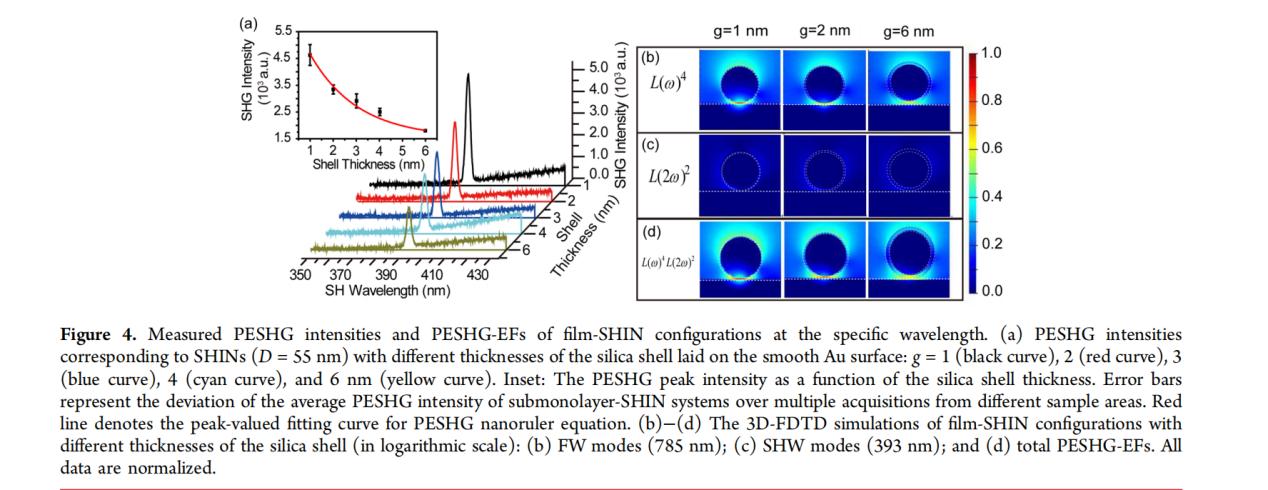 通過在金膜上放置具有不同厚度二氧化硅殼層的SHINs,構(gòu)建了film-SHIN構(gòu)型(如圖2所示)。使用可調(diào)諧的鈦寶石激光器進(jìn)行SHG測(cè)量,入射角為45度,以優(yōu)化信號(hào)強(qiáng)度和減少背景噪聲。采用三維時(shí)域有限差分法(3D-FDTD)計(jì)算模擬以驗(yàn)證實(shí)驗(yàn)結(jié)果,并分析PESHG增強(qiáng)因子(PESHG-EF)與納米間隙大小之間的關(guān)系。從而得到了不錯(cuò)的實(shí)驗(yàn)結(jié)果。