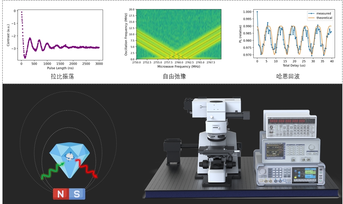 北京卓立漢光儀器有限公司推出的基于NV色心的Finder-NV光探測磁共振(ODMR)測試系統(tǒng)可在CW-ODMR和Pulsed-ODMR之間切換。在CW-ODMR模式下,可測試NV色心在磁場下的塞曼分裂,實(shí)現(xiàn)高空間分辨率下高靈敏度探測弱磁場信號;而縱向零場劈裂的大小受溫度變化影響極大,NV色心可作為溫度傳感器感應(yīng)溫度變化。在Pulsed-ODMR模式中,通過對電子自旋施加動力學(xué)解耦脈沖序列(Dynamical Decoupling)進(jìn)行量子操控,可測試NV色心中的拉比振蕩(Rabi Oscillations),哈恩回波(Spin Echo),自由弛豫衰減(Free Precession)等過程。