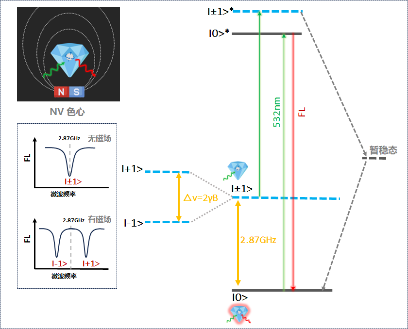 NV色心中的電子有三種自旋狀態(tài),可以用符號表示為|0〉、|+1〉和|-1〉。我們可以將其簡單理解為這是電子旋轉(zhuǎn)的三種“姿態(tài)”,對應(yīng)三個能級,或者稱為三個量子態(tài)。當(dāng)用一束特定波長的綠光去照射NV色心的時候,能把色心中的電子全部初始化到|0〉態(tài)。在|0〉態(tài),NV色心會以輻射發(fā)光的方式釋放激發(fā)態(tài)能量,發(fā)出紅色熒光,NV色心處于亮態(tài)。如果此時對NV色心施加微波場,當(dāng)微波頻率與 NV電子自旋躍遷能級差相等時,就會發(fā)生共振,NV色心便從|0〉 態(tài)躍遷到|+1〉和|-1〉態(tài),這時處于激發(fā)態(tài)的電子要經(jīng)過系間竄越過程,先到達(dá)暫穩(wěn)態(tài)后退激返回基態(tài),此過程不會輻射發(fā)光,因此會檢測到熒光計(jì)數(shù)下降,NV色心處于暗態(tài)。由于NV色心熒光具有自旋依賴性,我們可以用激光來探測NV色心電子順磁共振信號,該方法也被稱為光探測磁共振(Optically Detected Magnetic Resonance,ODMR)