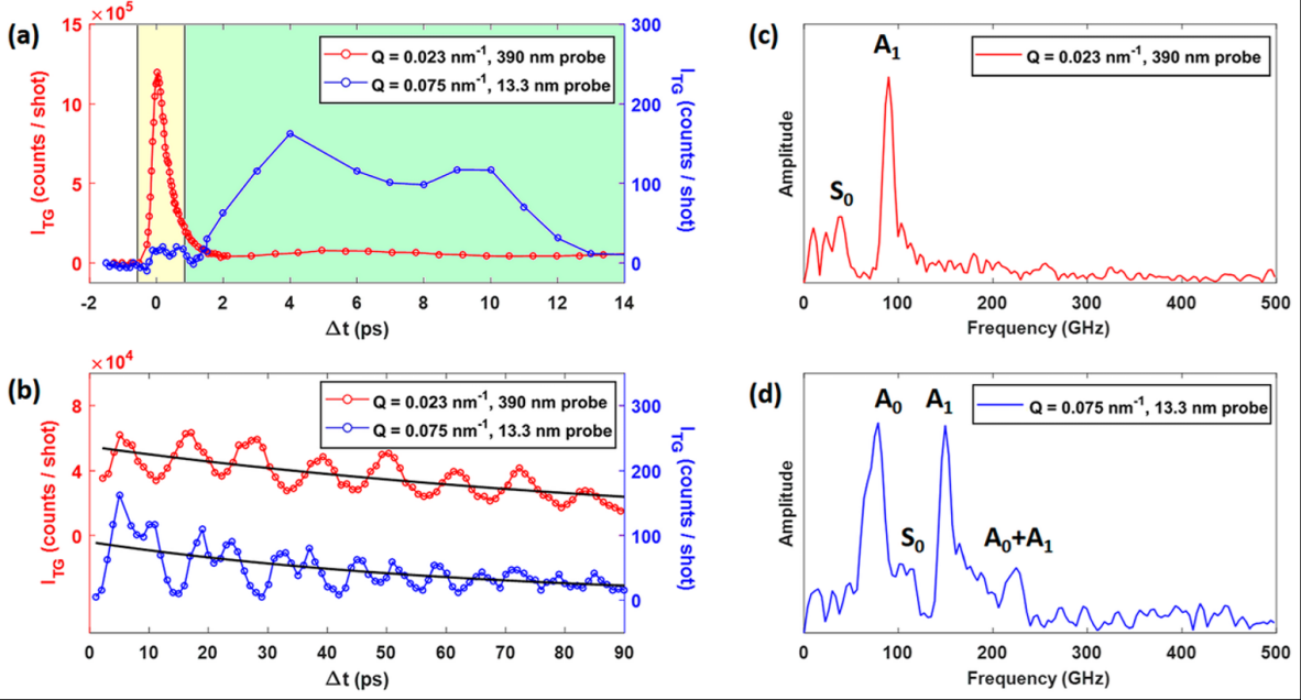 Naumenko等人報告了使用EUV TG測量57 nm厚碳化硅(SiC)薄膜在Q大于1 um-1情況下的機械和熱響應[ACS Appl. Nano Mater. 2019, 2: 5132−5139]。SiC是一種重要的第三代半導體材料,可用于新型高功率半導體器件,同時在基礎科學和應用科學領域都有廣泛的研究。其熱響應的特征時間尺度與預期存在較大偏差,這意味著在小尺寸下擴散區(qū)可能容易被擊穿,因此利用EUV TG對該薄膜進行納米級熱彈性性質進行完整的表征非常重要。從圖2中可以看出,接近Δt = 0時光學和 EUV 探針突顯了明顯的差異。光學探針獲得的數(shù)據(jù)特點是ITG急劇增加,然后快速衰減,具有緩慢的調制;而EUV 探針獲得的波形僅在Δt = 0附近顯示小的“階躍狀”行為。這是因為光學探測對激發(fā)產生的電子空穴對非常敏感,即對EUV TG相互作用突然產生的電子激發(fā)的布居光柵非常敏感。而在EUV探測的TG中,折射率變化主要由總電子密度的變化決定,因為EUV 波長遠離任何電子-核共振。因此,光學探測的EUV TG實驗中觀察到的快速電子衰變涉及許多過程:電子-聲子耦合、俄歇復合、碰撞電離、擴散、電荷俘獲等,對每個過程的動力學評估都需要詳細研究。