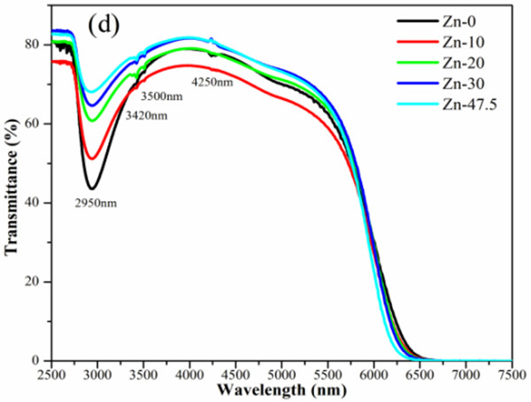 (d) 樣品在不同硫酸根用量時650℃熱處理3h后的紅外透射光譜圖。