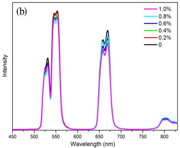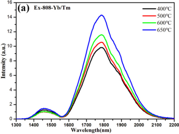 (b)樣品在不同硫酸根用量時650℃熱處理3h后在808nm激光激發(fā)下的近中紅外發(fā)光,