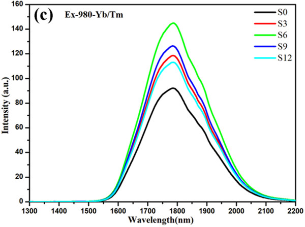 (c)樣品在不同硫酸根用量時650℃熱處理3h后在980nm激光激發(fā)下的近中紅外發(fā)光,