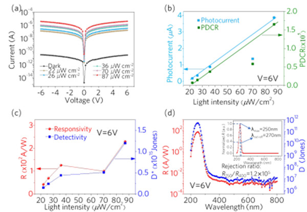 圖2.(a)在不同條件下半對數(shù)坐標中器件的I-V特性。(b)光電流和PDCR,(c)R和D*對光強的依賴關系。(d)MSM ε-Ga2O3 SBPD的R和D*隨波長的變化曲線。插圖為器件的歸一化光譜響應曲線。