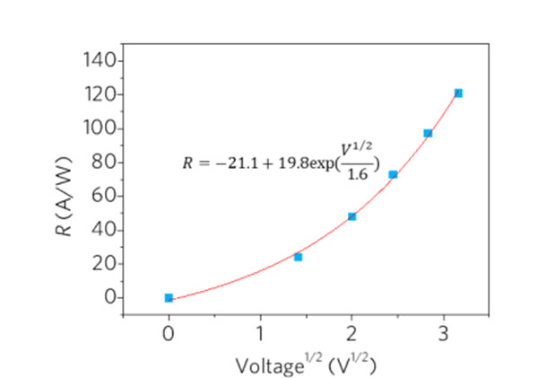 圖4. 響應光譜的峰值響應度作為V1/2的函數(shù)曲線。