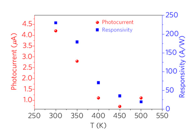 圖6. MSM ε-Ga2O3 SBPD的I-V曲線對溫度的依賴關系。