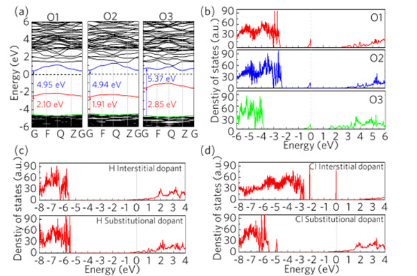 圖9.(a)ε-Ga2O3中三種不等價氧的能帶結構圖。藍色和紅色的值分別表示禁帶寬度和價帶頂上部的氧空位引入的缺陷能級。(b)三種不等價氧,(c)間隙/替位雜質(zhì)H和(d)間隙/替位雜質(zhì)Cl 引入的缺陷能級態(tài)密度。