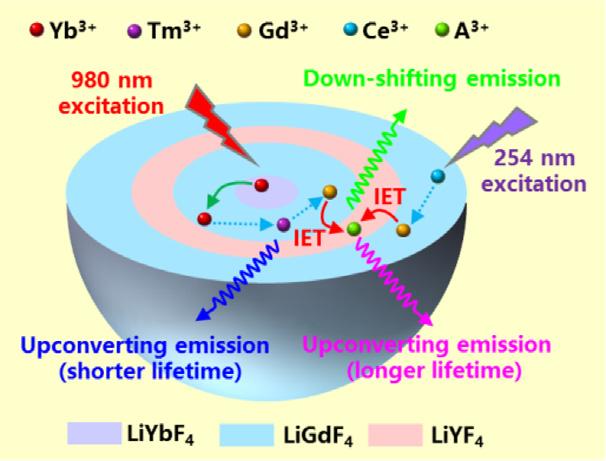 華南理工大學課題組近日成功合成了LiGdF4為基質核殼納米結構,該核殼結構中較遠位置的釓離子Gd+3通過表面能量轉化與摻雜的離子可實現上轉換和下轉換熒光發(fā)射。使用980nm和254 nm不可見的雙波長激發(fā)下,可以實現單個納米粒子的三通道可見區(qū)熒光發(fā)射。相關成果以“Tri-channel photon emission of lanthanides in lithium-sublattice core-shell nanostructures for multiple anti-counterfeiting”為題發(fā)表于Chemical Engineering Journal 397 (2020) 125451。