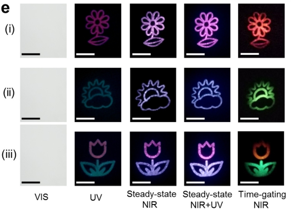 下圖為華南理工大學課題組將合成材料應用到熒光防偽中,(i)(ii)(iii)分別為摻雜不同激活劑的鋰集納米核殼材料。三幅圖案在可見光照射下,在紫外(254nm)照射下,穩(wěn)態(tài)近紅外(980nm)照射下,穩(wěn)態(tài)近紅外(980nm)+紫外(254nm)同時照射下,和時間門控近紅外(980nm)照射下顯現出不同的顏色??梢姽庹丈鋾r均不能顯現,展現其隱形性能,不同照射條件,圖案顯現出明顯的差異,同時因為上轉換有著較長的壽命,且不同輻射能級的壽命不同,又增加了時間維度的防偽功能。