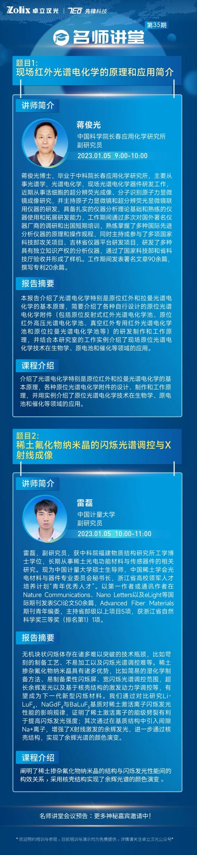 本期卓立漢光隆重邀請到了中國科學院長春應(yīng)用化學研究所,副研究員—蔣俊光老師和中國計量大學,副研究員—雷磊老師,兩位老師將與大家分享自己科研領(lǐng)域的經(jīng)驗和心得體會。希望本次講座能夠為您的科學研究帶來靈感與助力,推動研究的進展,精彩不容錯過,掃描下方的二維碼,趕快報名開啟學習之旅吧~第35期名師講堂