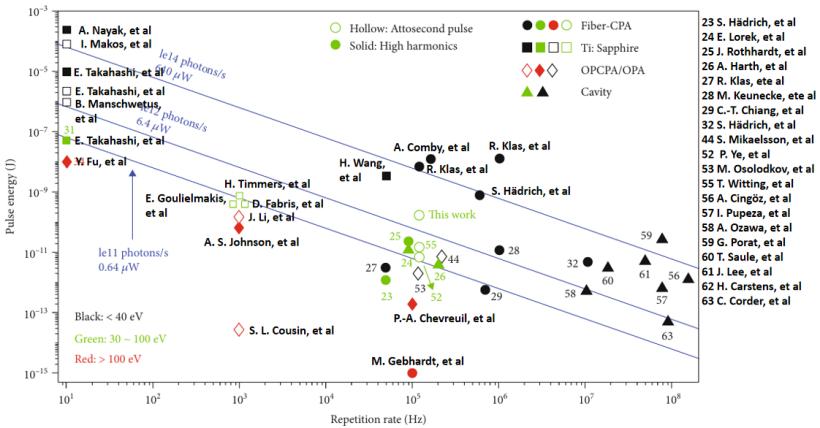 近些年,隨著高重頻高平均功率飛秒激光系統(tǒng)的發(fā)展,激光系統(tǒng)的平均功率可達到千瓦水平,產(chǎn)生的極紫外高次諧波光源可達到近毫瓦水平(圖3),進一步拓展寬帶極紫外光源的應用,使得高次諧波光源成為一種非常有應用潛力的光源,不僅在原子分子和凝聚態(tài)物理等基礎科學領域,目前更是在往半導體檢測等應用領域拓展。