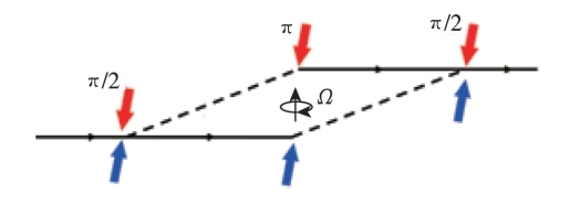 原子干涉陀螺儀的原理與光學(xué)干涉陀螺儀類似,利用了原子作為物質(zhì)波的波動性,基于Sagnac效應(yīng)完成角速度的測量。原子干涉陀螺儀工作過程主要包含原子團(tuán)制備、原子分束、原子反射、原子合束和干涉相位測量,其基本原理如圖 8所示。原子束中的原子經(jīng)內(nèi)態(tài)選擇后全部處于基態(tài),然后經(jīng)拉曼光脈沖分別實現(xiàn)分束、反射和合束,*后通過干涉條紋的相位測量獲取轉(zhuǎn)動信息。