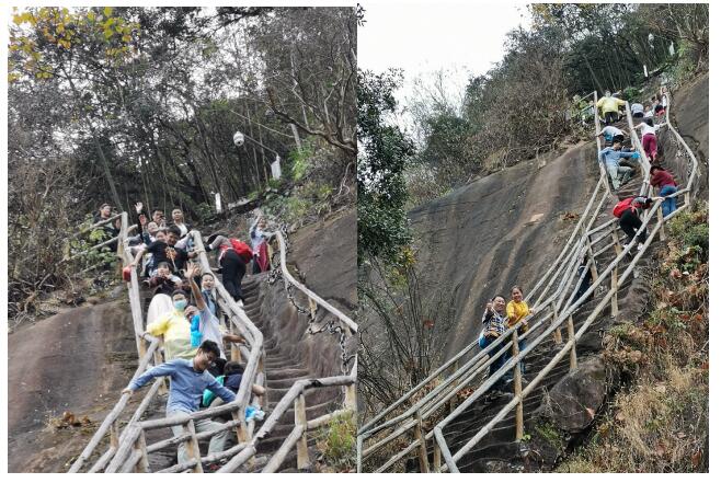 第一天的興奮還未散去,就開始了我們第二天的挑戰(zhàn)之旅。這一天我們挑戰(zhàn)了1638級的祥云梯,來到祥云梯腳下,只見告示牌上寫著“量力而行”四個字,極目望去,高不見頂,內心一陣掙扎,山不在于高,而因為陡,我們彼此相望,互相打氣,踏上這幾乎80°的階梯,然而挑戰(zhàn)并沒有結束,等待我們的還有一條全透明高空景觀玻璃橋,該橋全長316米,橋面通體透明,可以非常清楚地看到谷底的景色,如果在谷底仰望,玻璃上的人影也清晰可見。最終,一個都沒有少,我們登上了祥云梯,也走向更加驚險刺激的玻璃橋。