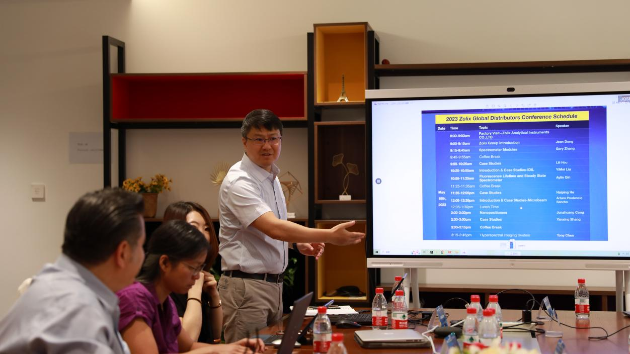 卓立漢光董磊副總經(jīng)理還帶著國際代理商和國內(nèi)產(chǎn)品用戶代表實(shí)地參觀了公司的研發(fā)中心與產(chǎn)品生產(chǎn)線,讓大家進(jìn)一步了解卓立漢光的產(chǎn)品品質(zhì),并且對產(chǎn)品和業(yè)務(wù)有了更深的了解與認(rèn)識。期間,業(yè)務(wù)發(fā)展部的專家們?yōu)楦鲊砩毯蛧鴥?nèi)產(chǎn)品用戶介紹了卓立漢光眾多自制產(chǎn)品線(包括主研制的光電模組、熒光、拉曼、光電探測、高光譜、光學(xué)機(jī)械與元件、納米壓電位移臺等)新產(chǎn)品新技術(shù),也互相交流了想法和經(jīng)驗(yàn),共同提升業(yè)務(wù)知識、探索全球市場。