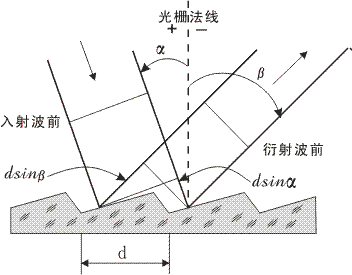 反射式衍射光柵是在襯底上周期地刻劃很多微細(xì)的刻槽, 一系列平行刻槽的間隔與波長(zhǎng)相當(dāng),光柵表面涂上一層高反射率金屬膜。光柵溝槽表面反射的輻射相互作用產(chǎn)生衍射和干涉。對(duì)某波長(zhǎng),在大多數(shù)方向消失,只在一定的有限方向出現(xiàn), 這些方向確定了衍射級(jí)次。如圖所示,光柵刻槽垂直輻射入射平面,輻射與光柵法線入射角為α,衍射角為β,衍射級(jí)次為m,d 為刻槽間距,在下述條件下得到干涉的極大值:mλ=d (sinα+sinβ)。