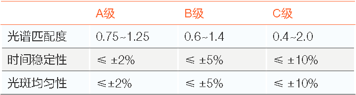 太陽光模擬器的不同級別對應(yīng)的光譜匹配度、時間穩(wěn)定性和光斑均勻性如下表所示(根據(jù)IEC060904-9):