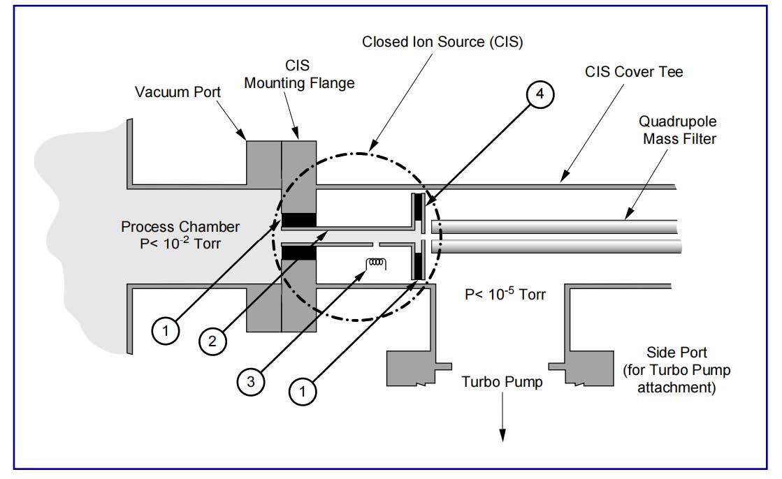 在需要測(cè)量10−4和10−2Torr之間的壓力的應(yīng)用中,通過(guò)用封閉離子源(CIS)采樣系統(tǒng)取代傳統(tǒng)的OIS PPR配置,可以顯著減少背景和工藝氣體干擾的問(wèn)題。一個(gè)通用的CIS設(shè)置的橫截面如圖3所示。