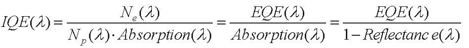 當(dāng)不同波長的光子入射到太陽能電池的光敏區(qū)域時,被吸收的光子會激發(fā)光敏材料產(chǎn)生電子和空穴,當(dāng)有外電路時即形成電流。此時產(chǎn)生的電子個數(shù)與被吸收的光子個數(shù)之比,稱為太陽能電池的內(nèi)量子效率。