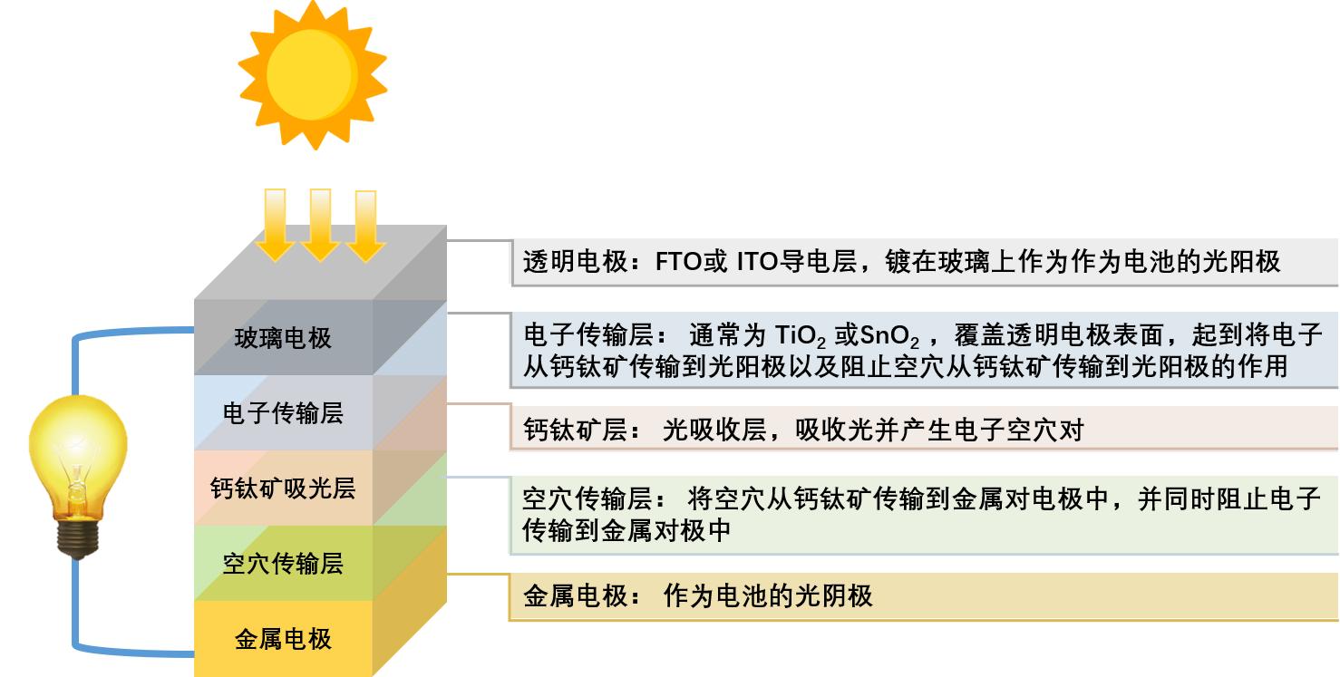 鈣鈦礦太陽能電池的基本結(jié)構(gòu)主要由透明玻璃電極、電子傳輸層、鈣鈦礦層、空穴傳輸層,金屬電極組成。鈣鈦礦太陽能電池目前產(chǎn)業(yè)化面臨的難題是大面積制備的穩(wěn)定性問題,研究人員們正通過對鈣鈦礦層結(jié)構(gòu)材料、傳輸層、電極材料以及封裝工藝進行優(yōu)化來改善其穩(wěn)定性能。