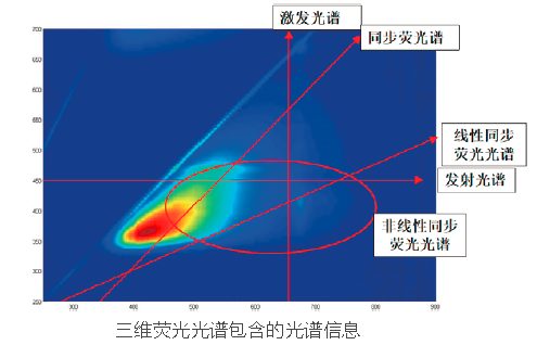 三維熒光光譜包含的光譜信息如右圖所示,分別為激發(fā)光譜、發(fā)射光譜、同步熒光光譜、線性同步熒光光譜、非線性同步熒光光譜。不難看出,一幅三維熒光光譜包含了我們現(xiàn)在所研究的大部分的熒光光譜信息( 激發(fā)光譜、發(fā)射光譜和同步熒光光譜) 以及我們在二維熒光光譜上無法觀測的光譜信息( 線性同步熒光光譜和非線性同步熒光光譜)。