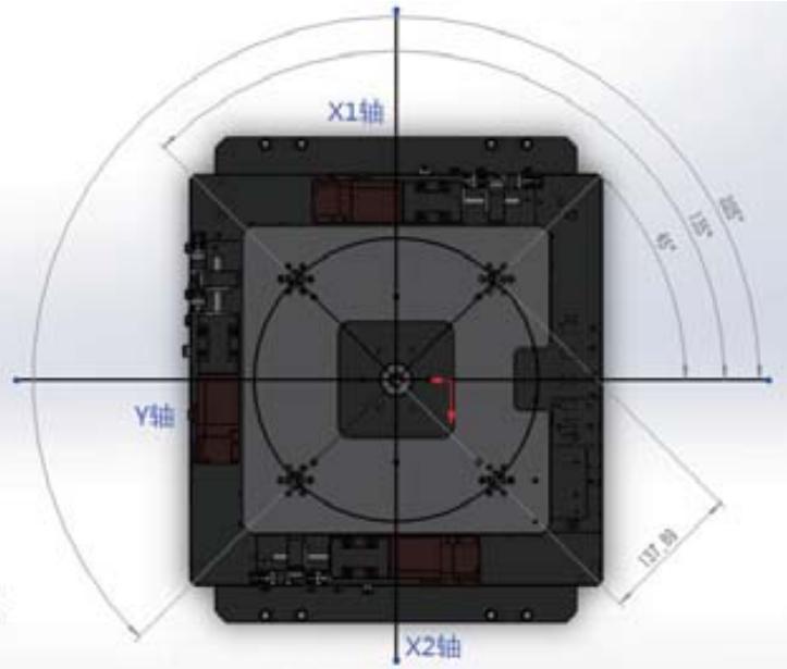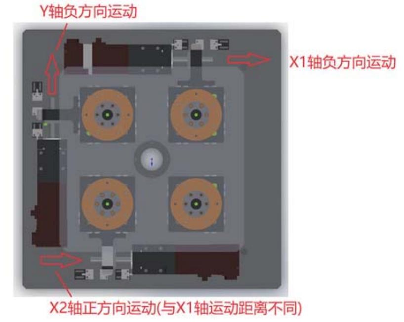 X方向運動:Y軸模組不運動,X1和X2軸模組同時運動(運動距離相同但模組運動方向相反),臺面便沿著X方向進行平移運動。