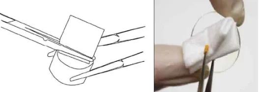 ?清潔時(shí)的夾持 :由于清潔光學(xué)元件時(shí),常用有機(jī)溶劑,應(yīng)盡量避免手( 即使是戴手套或指套 ) 接觸有機(jī)溶劑和元件。我們推薦用鑷子等工具來夾持光學(xué)元件,但最好使用木制、塑料等材質(zhì)較軟的鑷子。如果要使用金屬鑷子,也請?jiān)阼囎忧岸颂咨宪浶员Wo(hù)材料,以免損傷光學(xué)元件表面。