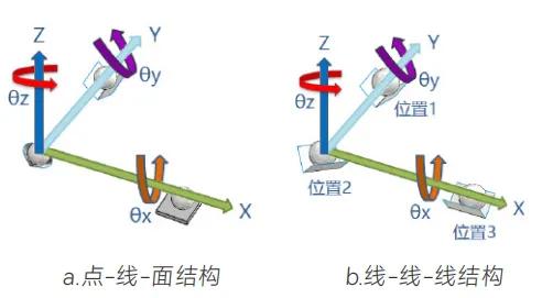 光學調(diào)整架的非共面調(diào)整機構(gòu)中,為了約束其它自由度方向的偏移,通常有 “點-線-面” 和 “線-線-線” 的結(jié)構(gòu)形式(參見圖7):