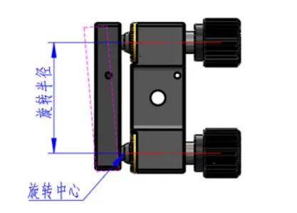 光學調(diào)整架的非共面調(diào)整機構(gòu)中,繞俯仰、偏擺的轉(zhuǎn)軸相交在一個角上(通常是鋼球所在的位置),由鋼球和一套螺紋副,構(gòu)成一個轉(zhuǎn)動軸,調(diào)整另一套螺紋副時,相當于調(diào)整架的前面板(活動板)繞此軸轉(zhuǎn)動(參見圖6a)。