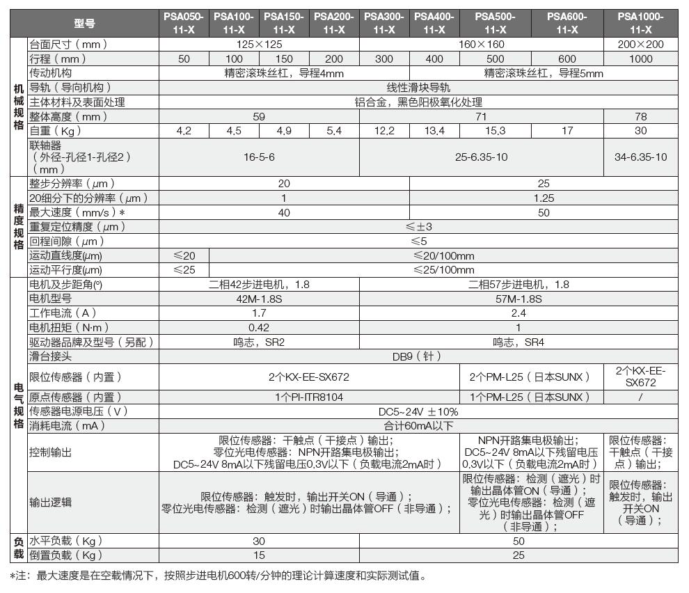 PSA系列精密電動(dòng)直線滑臺(tái)選型表: