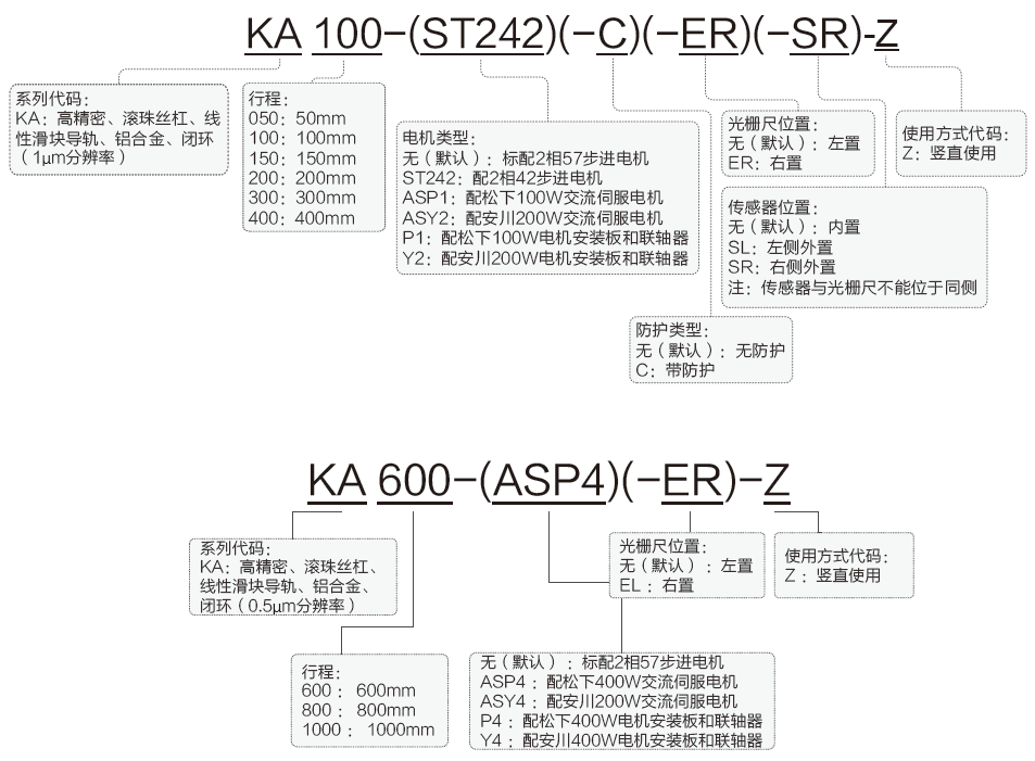KAxx-Z系列高精密電動(dòng)升降滑臺(tái)命名規(guī)則: