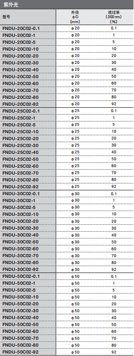 ?紫外光用中性濾光片的基板使用紫外光透過率很高的合成石英,從近紫外到可見光譜區(qū)具有幾乎相同的透過率。