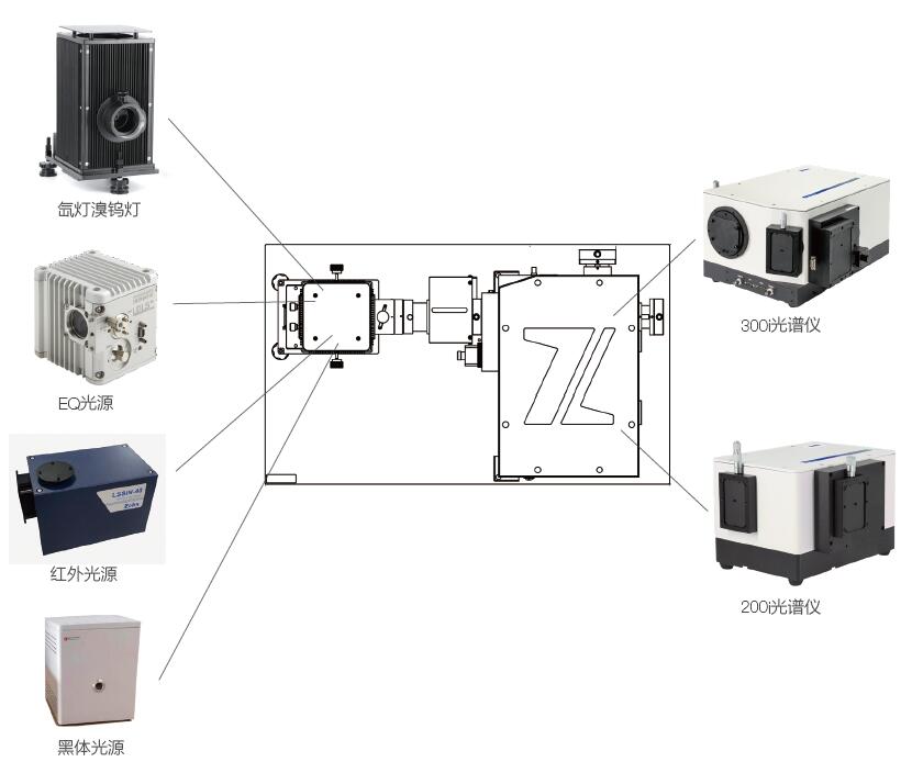 可調(diào)單色光源由復(fù)色光源與單色儀組合而成,如下圖所示,復(fù)色光源耦合進(jìn)入單色儀,經(jīng)過(guò)單色儀的分光而形成單色光。配合卓立漢光各種型號(hào)規(guī)格的配置,可以搭建各種類型的可調(diào)單色光源:光纖輸出模式,空間輸出模式,積分球輸出模式等。