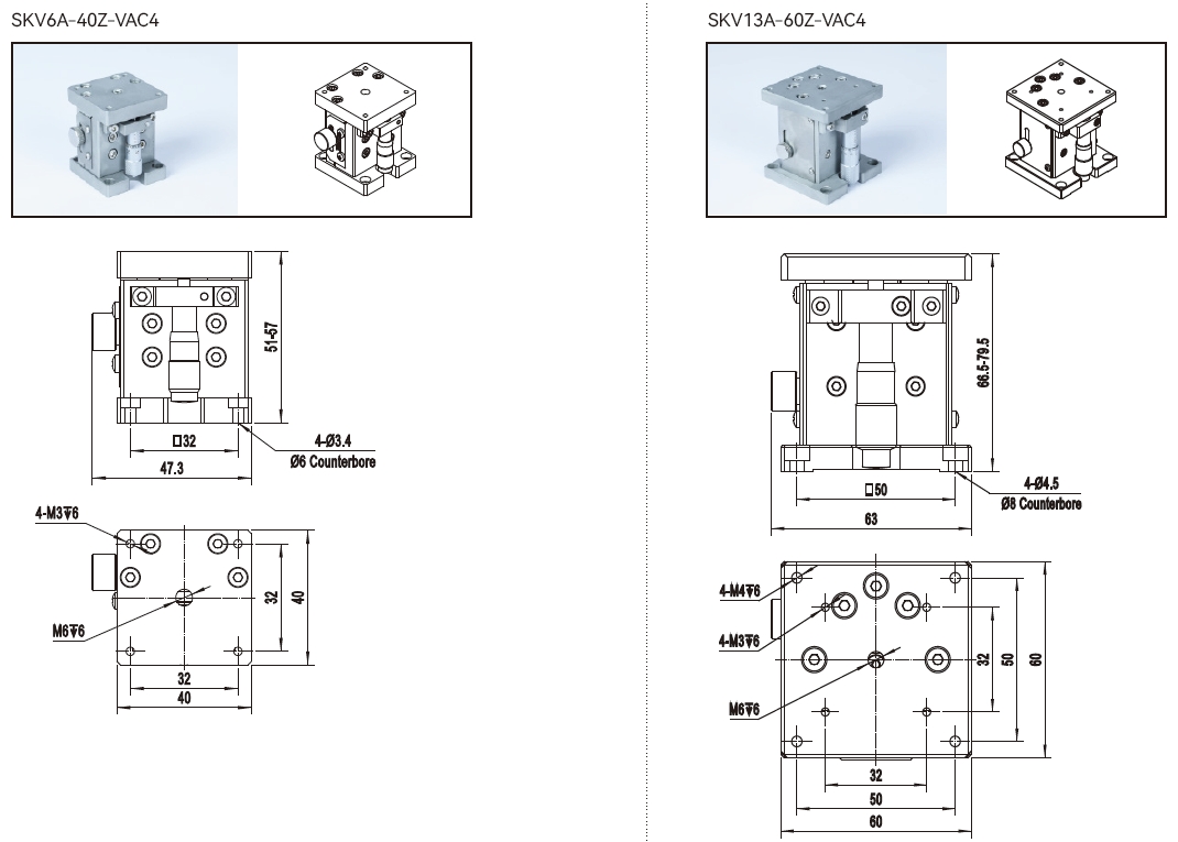 SKV 系列是采用直頂式結(jié)構(gòu)的高精密手動(dòng)升降滑臺(tái)。該系列產(chǎn)品采 用分厘卡驅(qū)動(dòng),使用直線滑塊導(dǎo)軌導(dǎo)向,保證臺(tái)面升降時(shí)具有很好的運(yùn)動(dòng) 精度。臺(tái)面多種標(biāo)準(zhǔn)孔位的安裝孔適合不同需要, 下方標(biāo)準(zhǔn)固定孔方便將 其與其他滑臺(tái)連接,組成多維移動(dòng)臺(tái)。