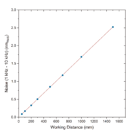 圖 1:不同工作距離下,在頻率范圍(1 kHz 至 10 kHz)內(nèi)的均方根(RMS)噪聲。噪聲隨工作 距離線性增加,歸因于激光相位噪聲的貢獻(xiàn)。