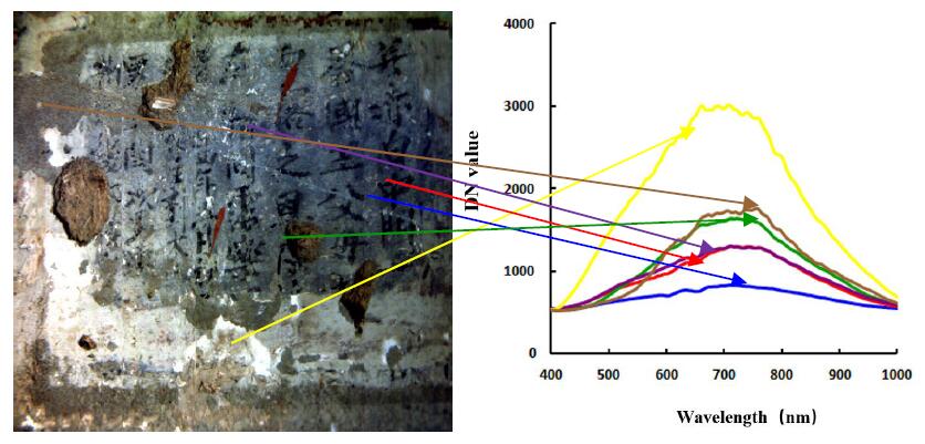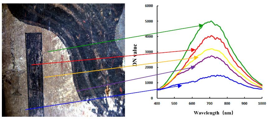 The following figures show the RGB (640 nm, 550 nm, 460 nm) true color synthetic data of the hyperspectral images of different components in the mural and the changes of DN at different positions in the images, respectively. From Fig. 2, it can be seen that the handwriting of the mural painting become blurred by natural corrosion, which changes the original spectral information and therefore increases the difficulty of identifying the corroded handwriting in the mural painting through spectral information.