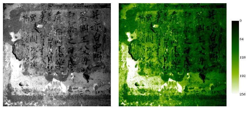 In order to objectively distinguish the variation of the internal components of the mural and the recognition of the mural handwriting, Principal Component Analysis (PCA) is performed on the pre-processed hyperspectral data to remove the redundant information between bands and compress the multi-band image information into a few converted bands that are more effective than the original bands. In general, the first principal component contains 80% of the variance information in the bands, and the first three principal components contain more than 95% of the information in all bands. Due to the uncorrelatedness among the bands, the foremost component bands can generate more colorful and better saturated color composite images. Fig.4 Compare and analyze the composite images of mural hyperspectral images before and after PCA changes, respectively.