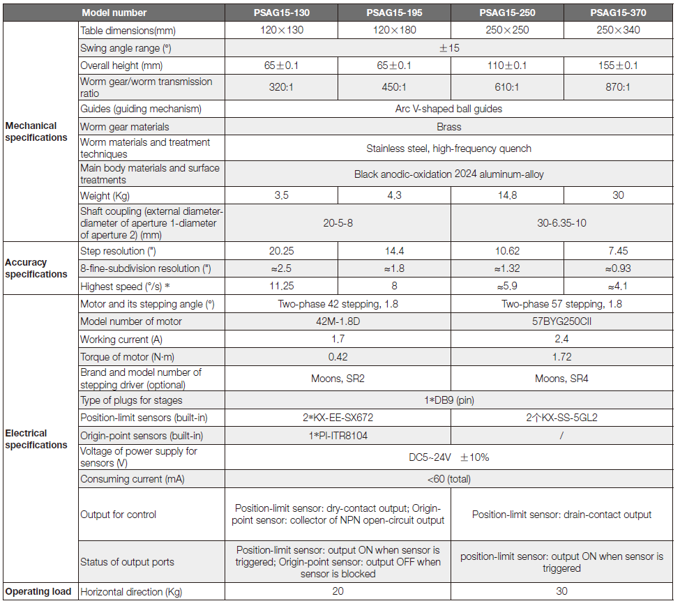 PSAG series motorized goniometers are made of hard black anodic-oxidation aluminum alloy which presents excellent appearance. Fine precise worm gear/worm and arc V-shaped guides are key parts of guiding mechanism. This combination guarantees higher strength, higher load capability and better durability.