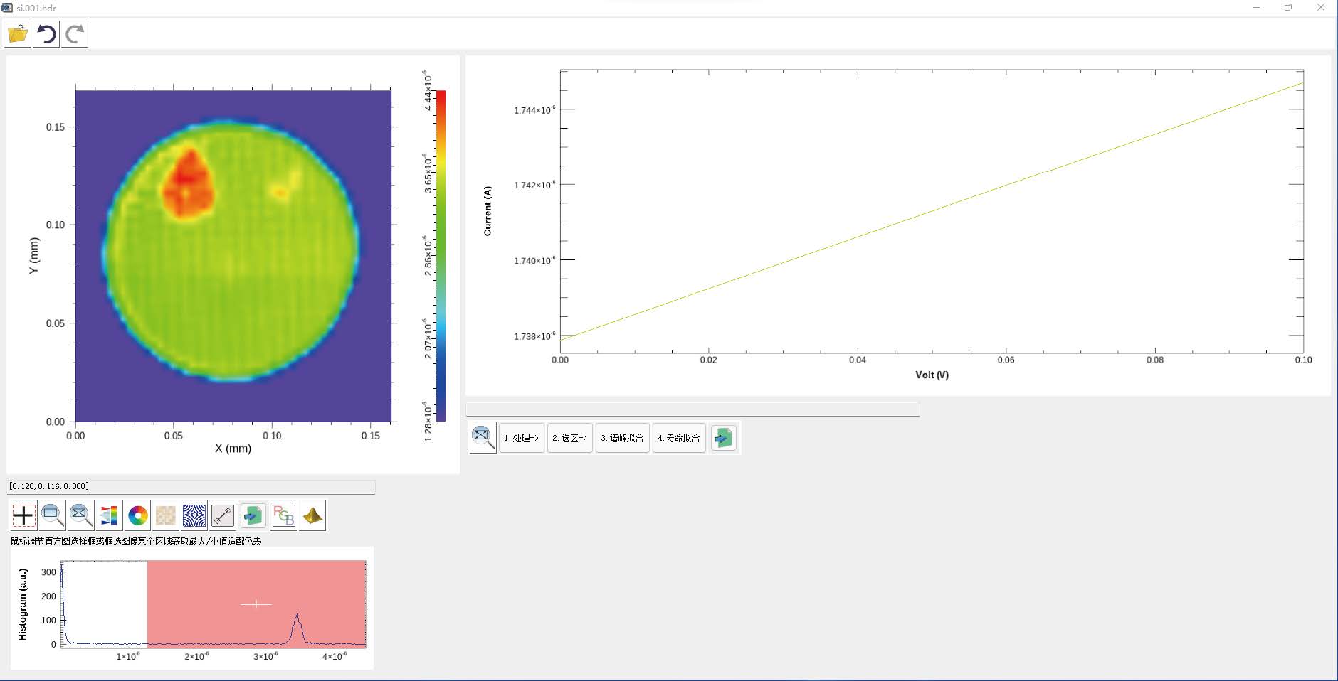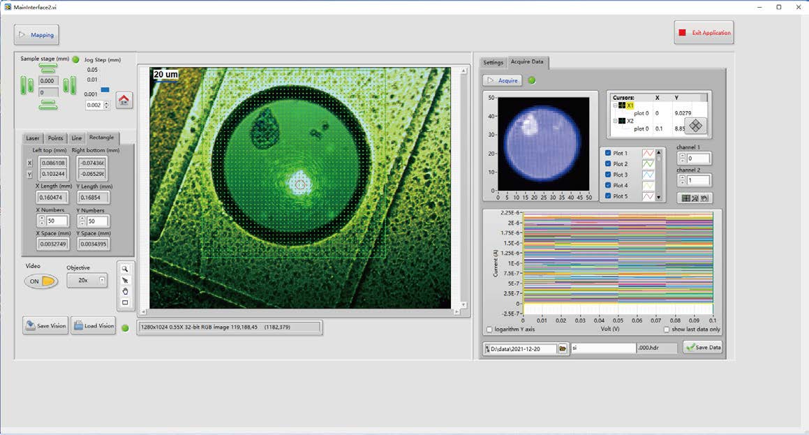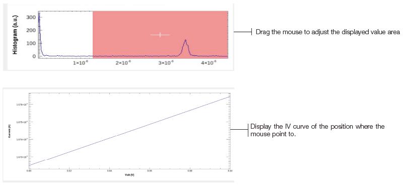Photocurrent scanning: Set a fixed voltage, record the current of different point. I-V curve scanning: Set a voltage range to acquire I-V curve of different point The scanning area can be selected. |