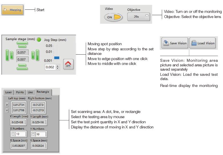 Reflective / Transmissive LED Lighting Objective Lens: Standard (20x, WD= 7.5 mm) Maximum Scanning range: 260 × 200 μm under 20x Objective Lens Spatial accuracy: less 1μm Minimum Step: 0.2μm Step Optional Range: 0.2 - 30μm Laser Spot: 2μm |