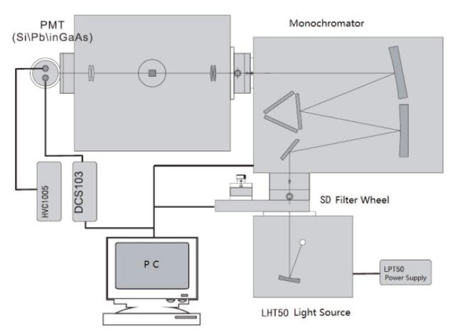 This system adopts the wide band wavelength tunable monochromatic light source and integrating sphere, down-looking configurations, sample stage for small drawer sample box, convenient to place the powder samples, easy to replace.