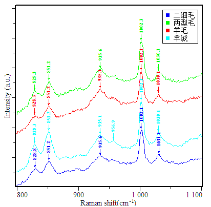 935 cm-1波數(shù)處的拉曼特征峰屬于 螺旋構(gòu)象的C-C骨架伸展振動,這一峰值表示變異山羊絨纖維的 螺旋含量的多少。從表中數(shù)據(jù)可以看出,毛纖維的 螺旋構(gòu)象的C-C骨架含量要明顯由于絨纖維。C-C骨架振動區(qū)出現(xiàn)在890-960 cm-1區(qū),主要是骨架的拉伸振動,表征變異山羊絨纖維的拉伸性能,通過該特征峰可以為羊毛、羊絨纖維的拉伸、防粘縮等工藝提供指導意見。